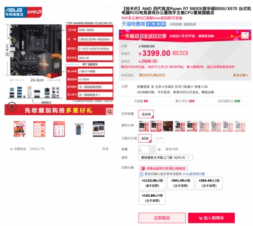 另外天猫商城还有华硕B550重炮手WIFI主板搭R7 5800X处理器套包,活动价2999元,另享3期免息福利,购买链接:https://detail.tmall.com/item.htm?id=630855073385&skuId=4667830663706