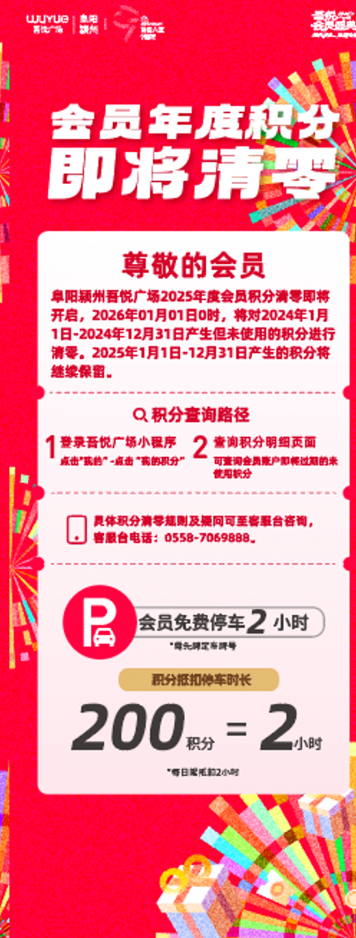 与此同时,商场会员积分清零提醒同步发布。据悉,2026年1月1日0时起,阜阳颍州吾悦广场将对2024年1月1日-2024年12月31日期间产生但未使用的会员积分进行清零,2025年1月1日-12月31日产生的积分将继续保留。会员可登录吾悦广场小程序,通过"我的"-"我的积分"路径查询积分明细及即将过期的未使用积分,及时兑换心仪礼品。