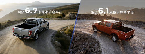 灵活性是衡量皮卡城市实用性的重要指标。瑞迈拥有6.1米的转弯半径,配合优化的转向与底盘设计,可实现“一把过弯”,在狭窄路段掉头或移库时更加灵活。风骏5的转弯半径为6.7米,在转向机动性上稍逊一筹。